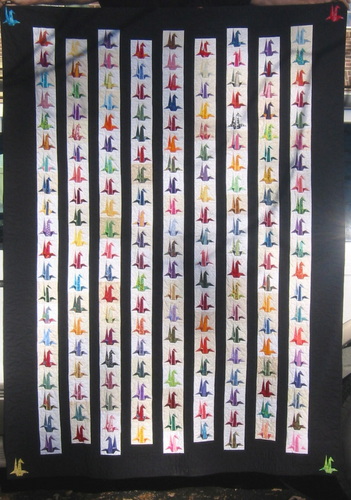 Thumbing through “The Big Book of Quilting” I came across a paper-pieced pattern of an origami crane. Immediately I recalled the Japanese legend that if someone folds 1000 paper cranes, their wish will be granted. I tried to visualize 1000 quilt blocks. 500 front and back? Not realistic, I thought. But I couldn’t shake the thought of 1000 cranes. When I got home, I did some research, and found that the legend is both ancient and modern. The modern part is from a young survivor of the atomic bombing of Hiroshima, who came down with Leukemia, and attempted to fold 1000 cranes before her death. I knew this quilt HAD to be made.