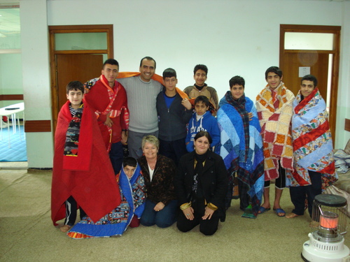 They were overjoyed to be receiving quilts that had themes of cars, basketballs and sports on them! Thank goodness we had lots of them!! Again, they showed their sensitive side (can they even have one after what horror stories they can tell?) when Tahseen told them the significance of the red heart. This truly seemed to mean a lot to these boys. Again, we handed out school supplies and had a fun group picture with lots of smiles and a few hugs (after all, these are teens!). The lady in the photo is a lovely, warm hearted lady who has worked at the orphanage for 30 years! Joe had met her two years ago when he visited the kids. She remembered him also.