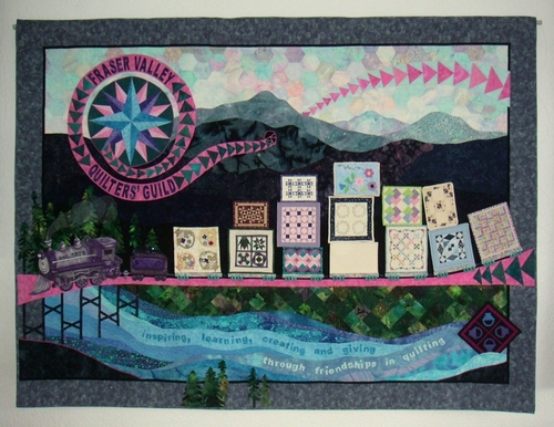 We wanted the colours of our guild logo, which are purple, pink, teal and blue. We also wanted to design a quilt that somehow, spanned 30 years. Using different techniques and patterns we accomplished it. The quilt looks like the Fraser Valley, from the mountains, to the river, to the trees and the train. We asked 13 ladies from the membership to make us a small quilt, without telling them what it was for. The instructions were simple, make a traditional quilt, completely quilted and bound. We asked them to let us know what pattern they were going to do so that we didn't end up with multiples of one pattern but other than that we waited until Feb for them to all be turned in. And then had so much fun one afternoon laying them all out on our train, just in awe of the workmanship of these tiny pieces.