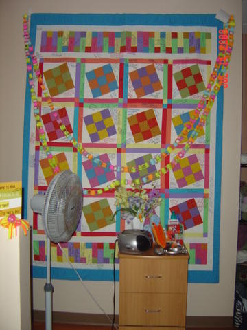 Upon receiving the quilt, everyone in the care facility had to come and sign it. It was a huge hit! It was on my niece's bed for a while, but they have it on the wall now. The bright colors really help personalize the stark hospital room. My intention was a quilt made with love and prayers for her to show off and share, giving a place to focus attention and conversation away from her all the time. That has worked wonderfully and I'm so glad I did this!
