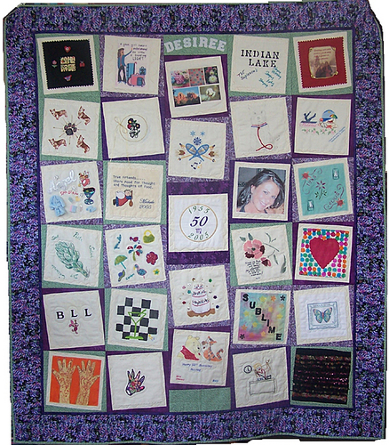 A friend of a friend, Desiree, had an idea for her 50th birthday. She would have her friends, family and co-workers decorate blocks and she'd make a quilt. She went to JoAnn's and got help estimating how much muslin to buy and picked out a couple of other fabrics. It took Desiree almost a year to get all the blocks back and by then, she had lost her nerve, having never made a quilt before. I met with her and gave her some tips about cutting sashing strips and sewing the blocks together in rows. Months later, I ran into Desiree who sheepishly admitted that she still had not done anything about making the quilt.