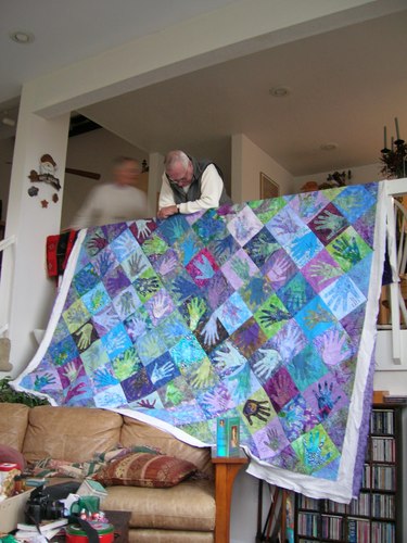 Early that fall Quilter's Newletter Magazine published a pattern utilizing peoples hand prints to make a quilt. I latched onto that, drew up a list of participants and started slicing up blocks of fabric. The mail went out and started flowing back in at a good rate. Reading not only the endearments family and friend had written on the blocks themselves but the notes that came back to me had me in tears a lot! By Christmas The quilt, now 8x8 feet, was stitched in the ditch but had yet to be quilted or bound.
