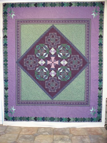 I do hope the picture will come through. Way back in 1987, I went to the Paducah quilt show for the first time. The quilts were just so awesome! I was so inspired by them. I came home just bubbling over with ideas. I designed and pieced this top in about two weeks. I tried to get the illusion of light moving across the surface. Then I had no idea how to quilt it, so I tucked it away to ripen. I forgot all about it.