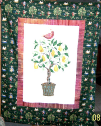 I used each stencil to cut out the light then dark green leaves. The tree trunk, 2 piece flower pot and pears have all been padded like trupunto before being quilted. I just loved the "pop" of pink/orange/fushia tie dyed border that matches outfits on the characters in the larger border.