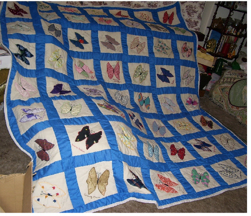 In cleaning up afterHurricane Katrina Carla Crane found her quilt top amoung ruble and destruction unharmed along with her Grandmothers Bible. I picked it up from her when we were in Pascagoula, Ms trying to help them drag wet, muddy, ruined parts of their lives out the door and to the street. The blocks in this top were made by her grandmothers, aunts, cousins and friends many years earlier because now so many of them are no longer living. After I got the quilt finished and gave it to her thru tears she said it gave her much comfort thru the troubles and trials of the aftermath of that devestating storm. She said it was if her grannys all had their protective arms wrapped around that quilt top and Bible protecting them.