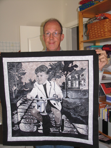 On my husbands 50 birthday I gave him what one day would be a quilt of him 3 years old on a tricycle. He already loved it and it was only just started. I made the quilt from a picture his mother gave me (2X2 inch big and black and white) Next month he will be 54 and guess what he will get the finished pieced because I DID it. The quilt is finished and it is great. He looks realy 3 years and cycling. My husband still love to cycle and maybe one day I will make a quilt of him now on his bycicle. Will be continued.......