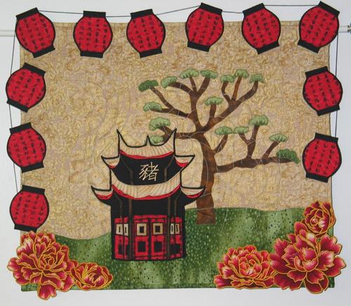 A pagoda was wanting to be made. Of the 5 challenge fabrics, I had to use 4 and could add up to 2 of my own. I used 4 of them and added 2. One was a focus print with flowers, cranes, groups of green for the trees. The "shingles" of the pagoda are the feathers from the crane. As each piece was made, the next step would come to me. I started only with a game plan of making the pagoda, it grew trom there. The pagoda, flowers, and the lanterns are sandwiched with timtex to give them the stability I wanted. Their is a boar quilted on the wallhanging, small meandering in monofilament thread surrounds it.