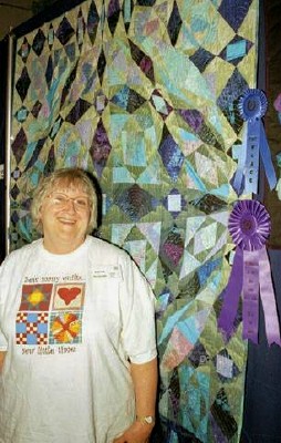 In 1999, I found a most interesting design in one of the Dover coloring books. It looked as though it would be a nifty grid to use to create a quilt. I copied it onto clear plastic, borrowed an overhead projector, taped several pieces of freezer paper to the wall, and used a Sharpie to transfer the grid portion of the design to the freezer paper. Then I put in Storm at Sea blocks, and paper-foundation pieced them. I quilted the resulting piece with spirals, using hologram thread, took pics, and sent them in to try to enter the Houston show. I was so excited when the letter came, telling me the quilt was juried in to the show. I sent it off and made plans to visit my brother and his wife the end of October at their home in Rockport, TX. I had been visiting them every year since they moved to TX. Oddly enough, my visits always coincided with the show in Houston-- funny how that worked out. At any rate, I left for Rockport some time before the show and had a nice visit with Mike and Sandy, then headed for Houston and the show. I went to the Award Ceremony to get a chance to see the winners before the show opened. As I was admiring the quilts and slides, and watching the nicely-dressed winners walk down to the stage to receive their awards, I suddenly saw that the slide on the screen was my quilt! I leaped to my feet, and yelled something like "Yeehah!" and happy-danced down to the stage, any shreds of dignity I might have possessed lying in tatters on the stairs. Somewhere there's a picture of me accepting my award wearing black cotton pants, yellow socks, orange Birkenstocks, and a T-shirt my DSIL had given me that said "Mental Illness Takes a Toll--Please Have Exact Change" (I'm a Psychiatric/Mental Health RN). During the rest of the week, people would come up to me and say, "I remember you from the Award Ceremony." I had been gone from home early and missed the call that would have let me know I should dress up more, LOL. The picture above was taken at our local quilt show, where I had just found out my quilt won Best Of Show.