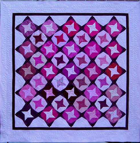 In 2004, when American Patchwork & Quilting was collecting blocks for making quilts to be auctioned to raise money for the Susan Komen for the Cure project, many of us who were on Alex Anderson's message board decided to make a whole quilt to be auctioned. Details of the blocks to be sent were worked out. Some sent blocks with light pink centers and dark backgrounds and others sent the opposite. All sent some extra fabric for the sashing. I assembled and quilted the top and sent it off to be auctioned on ebay.