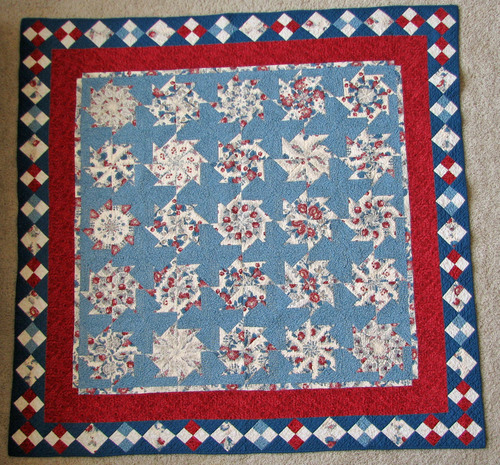 Quilt top originally pieced by Betty (Lisa's mom) who was diagnosed with Alzheimer's while she was working on this quilt top. Lisa asked me to rework the top because of the condition of the top and I agreed. I pulled the top apart and resewed all of the pinwheels. Then I added the original red border and pieced the outside border with leftover pieces of the original. Finally, I quilted the top after taking several machine quilting classes and doing several smaller projects. This was the first large quilt that I had machine quilted. Lisa's mom is in the final stages of Alzheimer's but Lisa has a quilt to remind her of her mom before the disease.