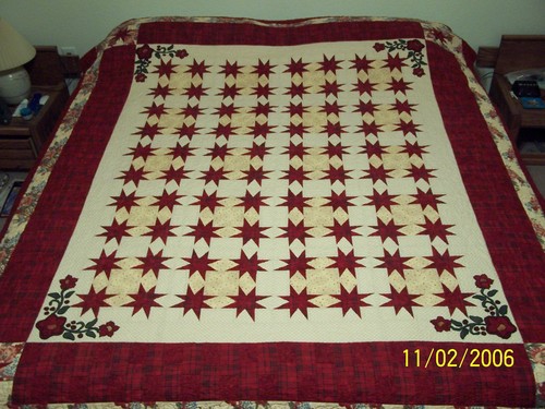 I started this project the summer of 2004, using fabric I had on hand but didn't like, thinking it would probably end up in the trash. Well it did work and I was stuck with what I was now calling the Ugly Quilt. I had help picking out boarder fabrics and hoped while I hand quilted it, I would start to like it. No such luck until, I put it through the washer and dryer for the first time. I spent a lot of time on the Ugly Quilt and was eager to see it clean and dry. When I pulled it out of the dryer the fabric had bled through the backing and all the stitches were red/orange, I was sick!! I put it back through the wash and said a prayer. It came out beautiful - From Trash to Treasure!!