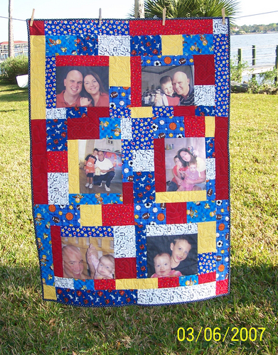 I had her daughter send me photos of the soldier, mommy and the children. I used a simple, pieced design around six 8" by 10" fabric photos. Then I used my extensive collection of children's novelty fat quarters to border the photos and make the quilt. I even found some Marine fabric to use as the backing.