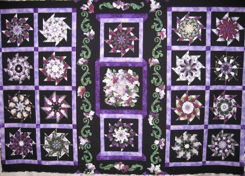 Her quilt was very, very large with a black background, some lilac kaleidoscopes and a medallion of some beautiful white kittens placed ever so gently within the fussy-cut, fused and machine-appliqued center of the lilac medallion collage. So cute they were... peeking out from behind the springtime floral display. The image of the sweet little kittens was something she had never used on anything, let alone a quilt, that being an iron-on from a craft store purchased 3 years previously; you know, one of those rubbery type things you cannot iron once it's on.