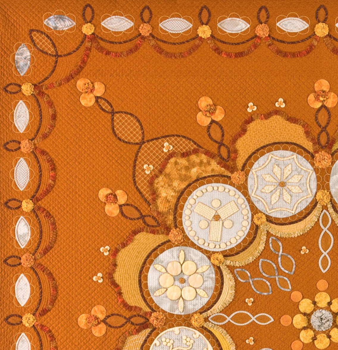 J: There are different scales of crosshatching, wider in the wide-open cheddar areas and tighter in the circles. This really adds a rhythm to the quilting. Do you mark the smaller areas in the same way?