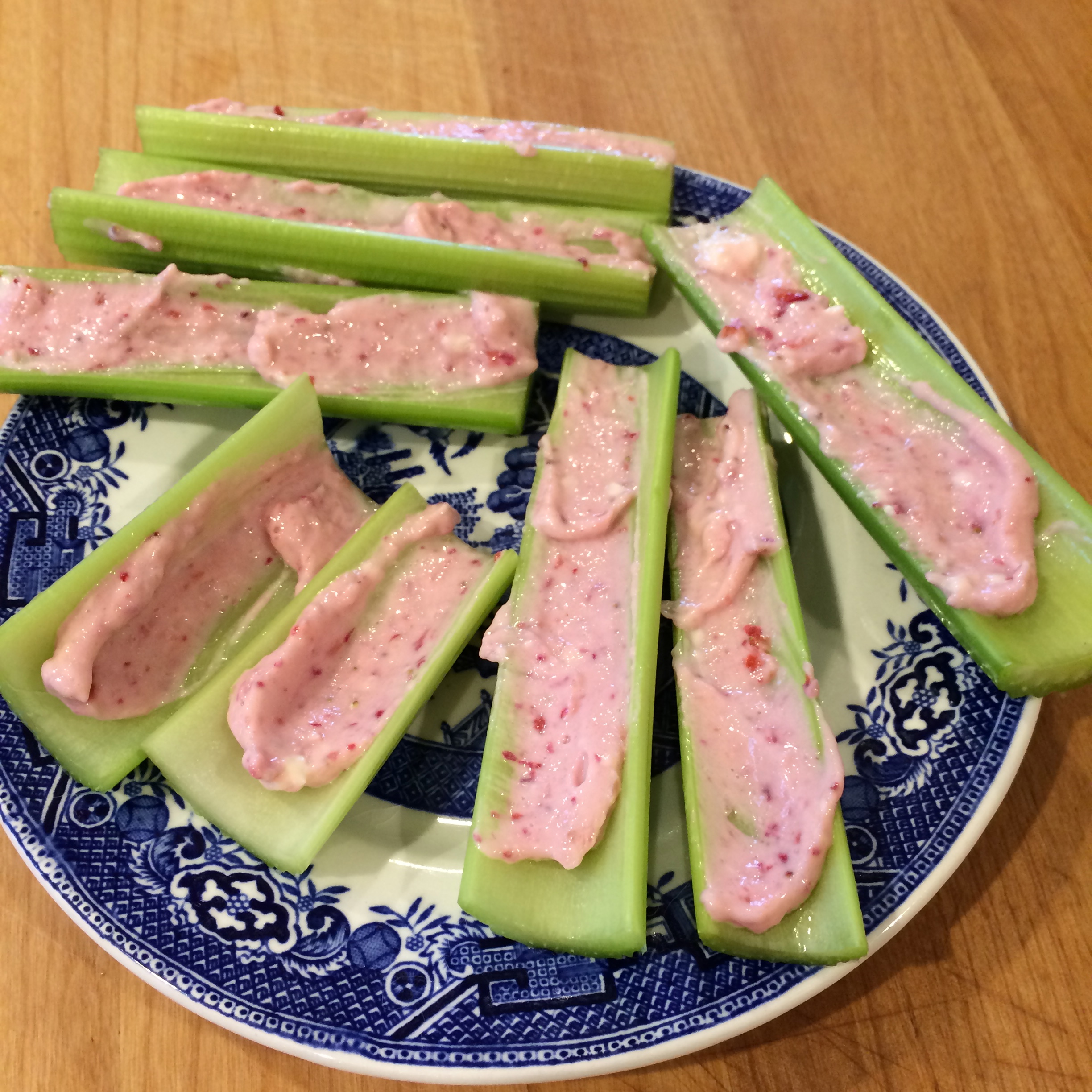 There are any number of things you can use these mashed strawberries for. They work as a topping for protein pancakes or English muffin french toast. I can mix them with a Laughing Cow Lite wedge to use as the celery topping.