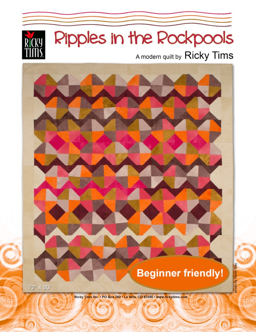 Ricky stepped into the modern quilt arena after having been asked to design a quilt for the Modern Quilts Unlimited magazine. This quilt is featured in the Spring 2015 issue. Ripples in the Rockpools is based on a traditional snowball quilt block, but instead of a single center, Ricky has done a wonky four patch. The original quilt features several new hand-dyed fabrics from his Rhapsody fabric line. The flexibility and freedom in constructing this quilt makes it a great project if you want to work on a joint effort with a youngster in your life.