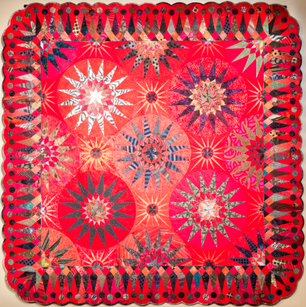 Reptile Wisdom uses an expanded two-color palette, English paper piecing by machine, paper foundation piecing, and machine appliqué. Karen insists on using 100% natural fibers in her batting. Reptile Wisdom won first place in the Traditional Pieced category at IQA Houston, 2014.