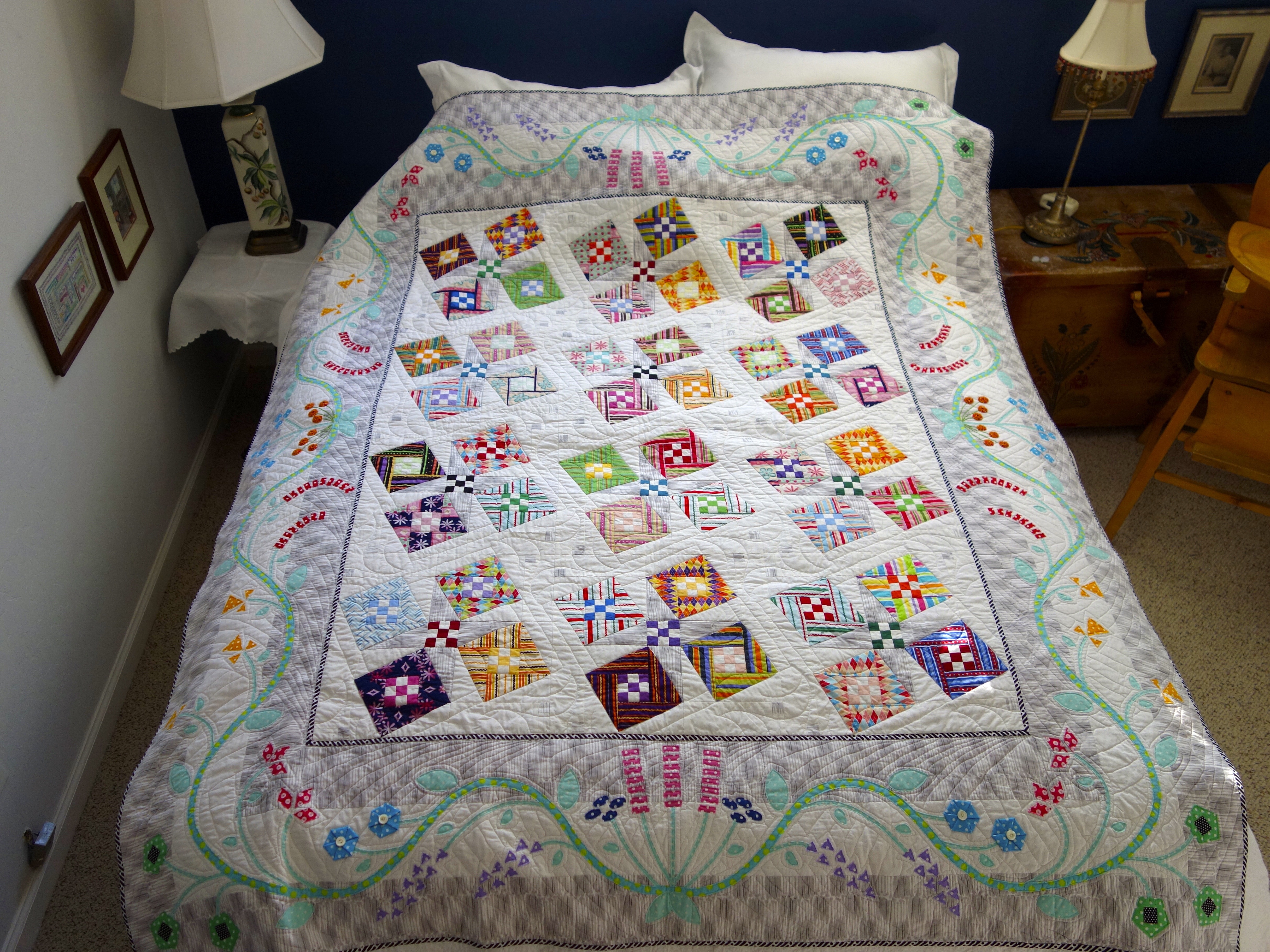 It's hard to capture in an online picture the real life look of a quilt. When I (Capt'n John) saw the sun streaming in the extra bedroom I grabbed the camera. I think that this picture captures the shadings of the white and grey and the vibrancy of the colors in the "blooms" better. (It is a queen-size bed. Yes, learning to "stage" is on my to-do list.)