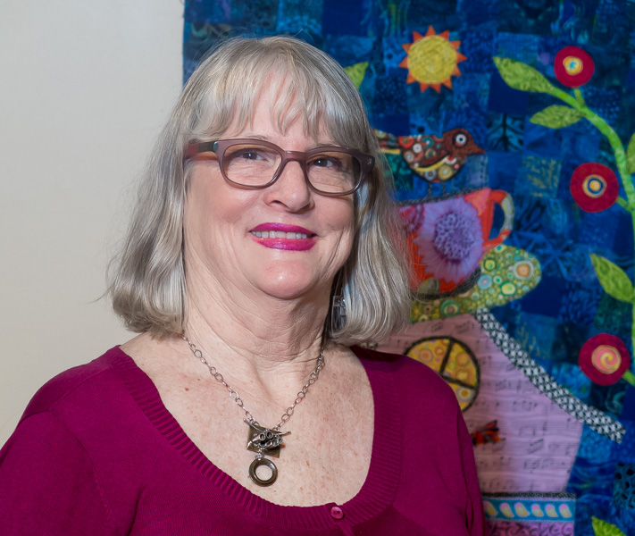 Jamie Fingal earned her reputation as a Rebel Quilter because she doesn’t like to follow the rules. She does like to have fun, though, and imbues her whimsical quilts with positive messages. Jamie often uses heavy-duty zippers in her work. She doesn’t bind her quilts. She uses wool felt for the batting and the backing. She also gives herself one day every week to just play in her studio and have fun, and create. Jamie carries a sketchbook with her everywhere and uses her drawings as inspiration for her quilts. She walks Alex through the process of making a small prayer flag art quilt, then shows Ricky how to build a quilt background using overlapping pre-fused hexagons.
