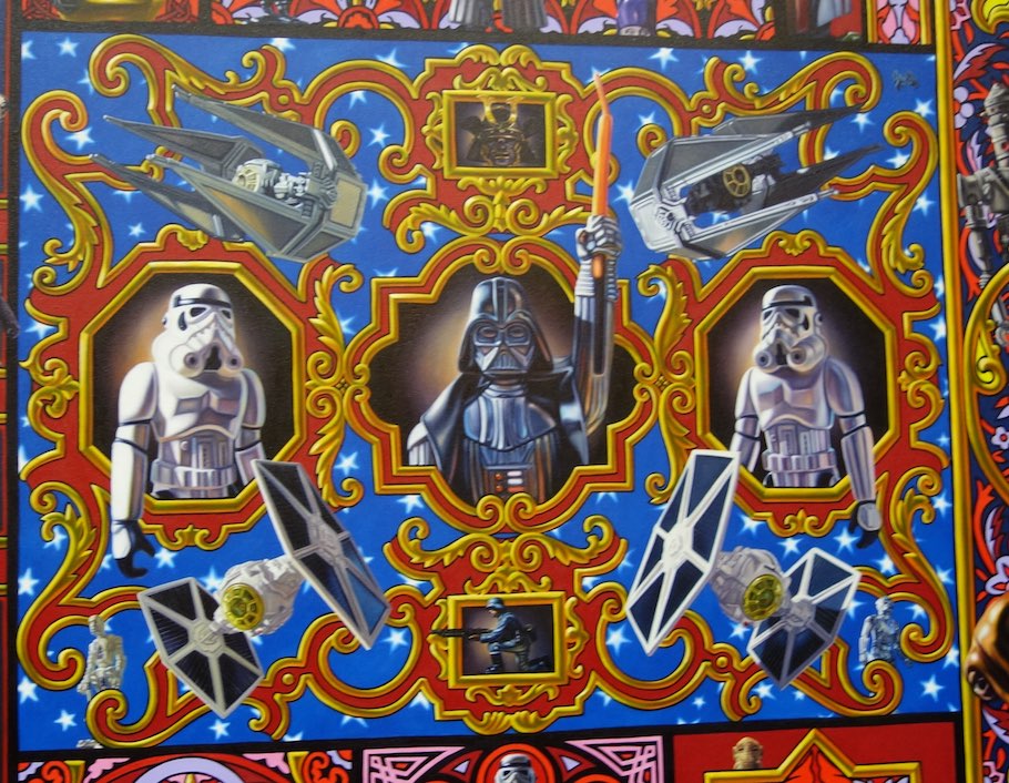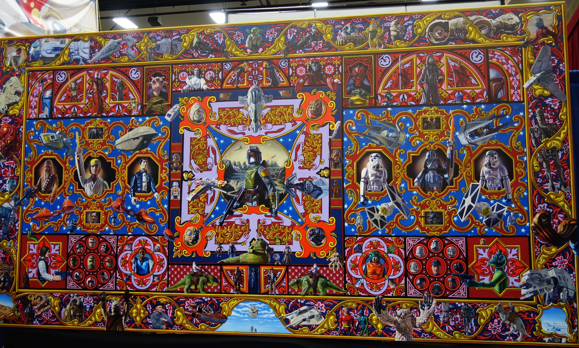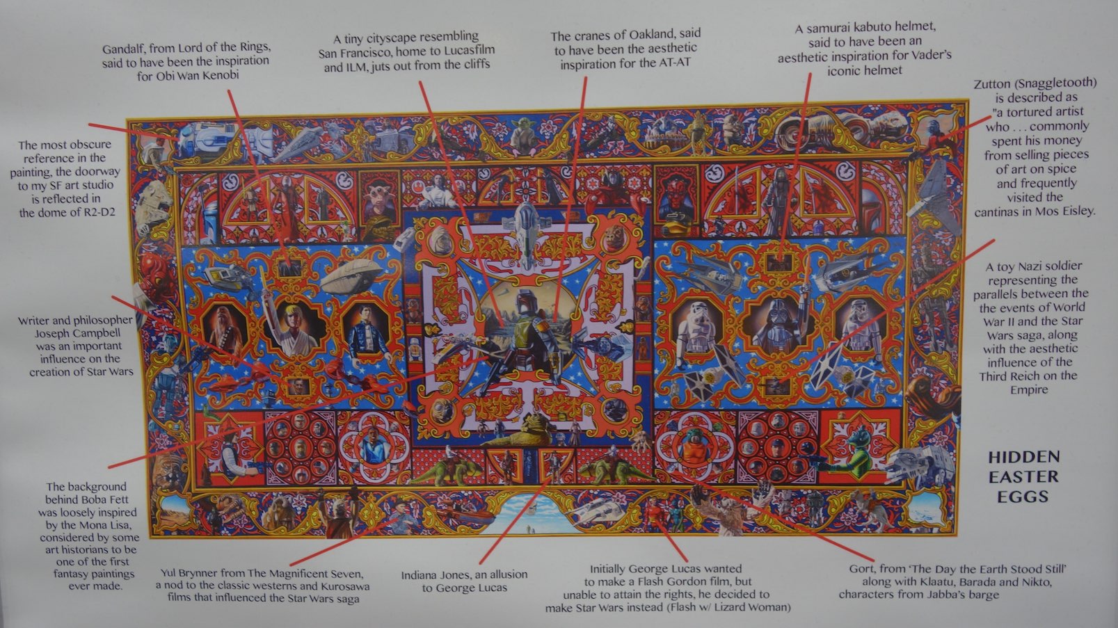 It took over 2000 hours of studio time and incoporates decorative motifs from many different cultures, including French tapestry design, Gothic stained glass, Persian and Moroccan rugs, illuminated manuscripts, and Eastern mandalas, and over 150 Star Wars images.