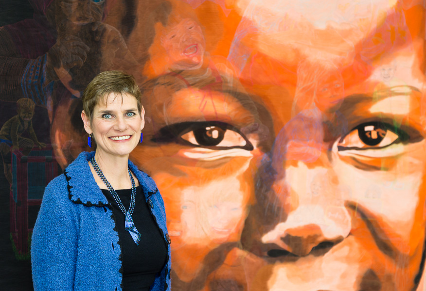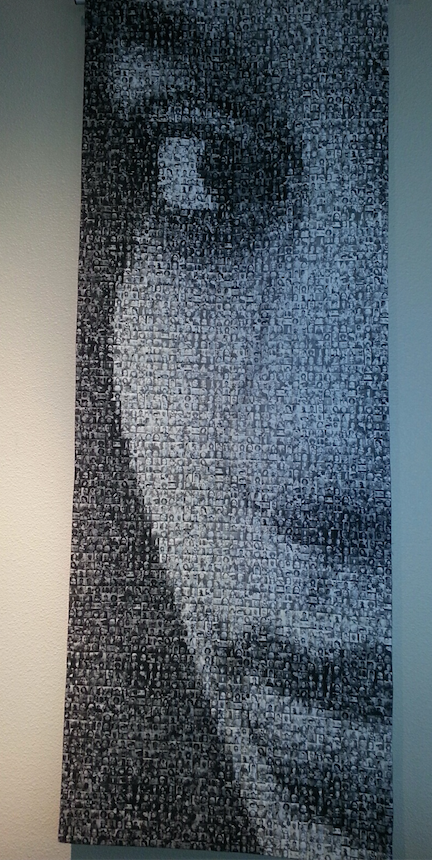 The black and white mosaic quilt features thousands of one-inch-square images of happy and upbeat women.