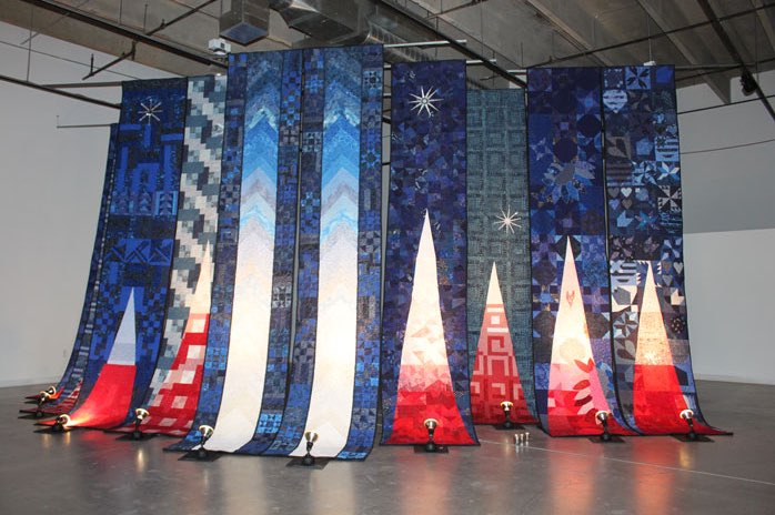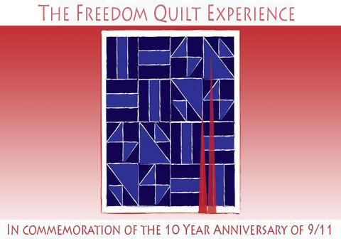 The Freedom Quilt Experience was commissioned to provide a backdrop for an exhibit of twisted pieces of metal from the World Trade Center. Originally designed for the 10th anniversary of 9/11, it is made from ten unique quilt panels, one panel for each of the ten years that had passed since 9/11/01. When put together, the quilt panels form a display 16 feet high and nearly 30 feet wide. Each panel was designed and sewn together by a different individual or quilt guild. A Better Quilt, Inc. was chosen as the longarm quilter.
