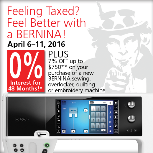 Feeling Taxed? Feel Better with a BERNINA! April 6 - 11, 2016 - 0% Interest for 48 Months!* PLUS 7% OFF up to $750** on your purchase of a new BERNINA Sewing, overlocker, quilting or embroidery machine.