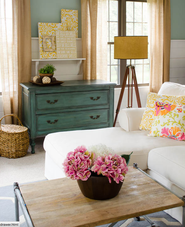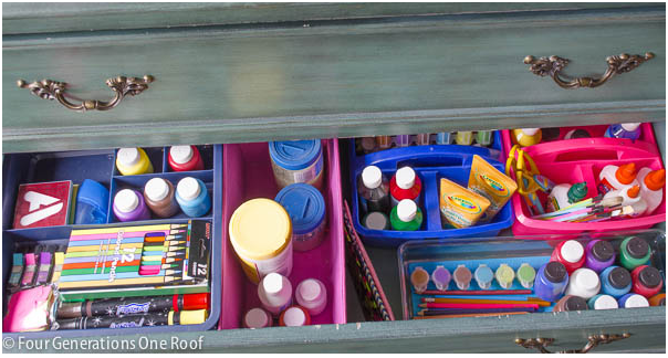 5. Short on storage space. Four Generations One Roof uses baskets to compartmentalize a dresser drawer in the living room.