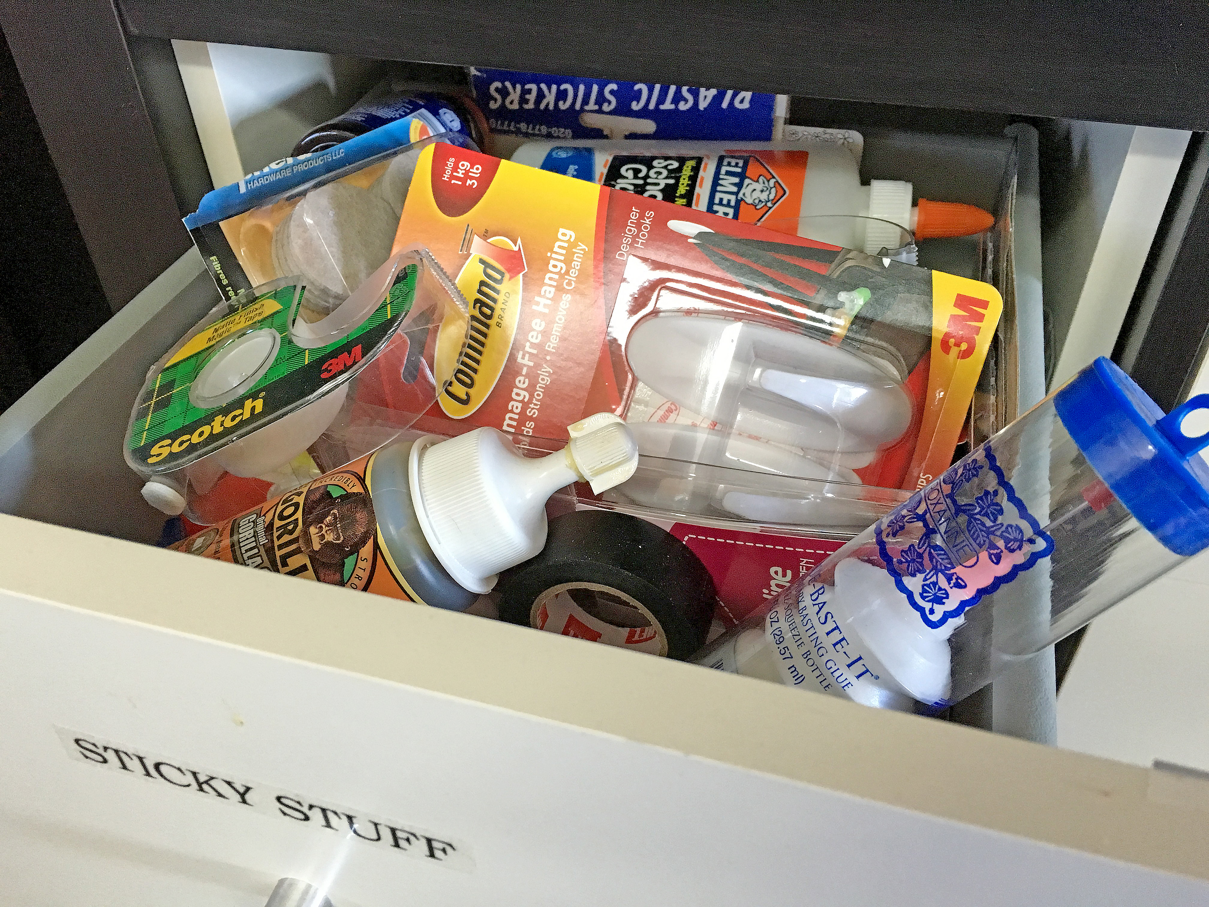 Ricky has a drawer dedicated to sticky stuff. "I find it it interesting that my most favorite drawer is called Sticky Stuff. If it sticks, it goes in that drawer—including sticky felt-feet that go on bottoms of nicknacks to keep them from scratching the furniture. The drawer is more organized than is shows in the photo, because I pulled things up to show what lives in there."