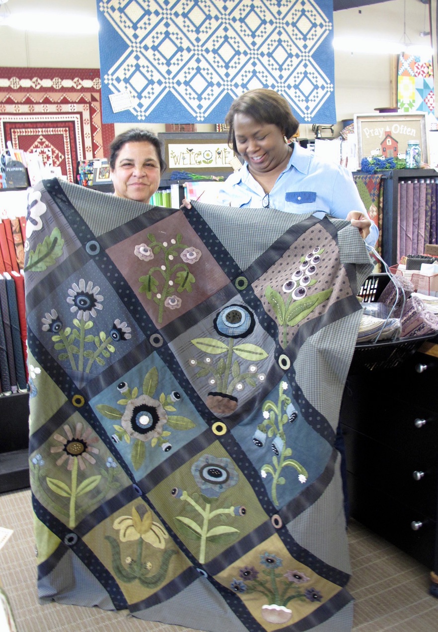 How lucky we are that Lisa Bongean, of Primitive Gatherings, decided to open a second shop in California! Having been a mail order customer of her shop in Wisconsin for years, I was really looking forward to the Quilt Roadies trip taking me to the shop in Murrieta. Talk about the Quilter's Disneyland!!! To actually see all the samples in person is the same feeling you get at a quilt show...photos never do them justice! Dru is the store manager and is a delight! They are very knowledgeable about all the products in the shop and we were lucky enough to have a customer show up with her latest creation. Barbara, finished this top in a month!!! (Now why can't I do that?!!!)