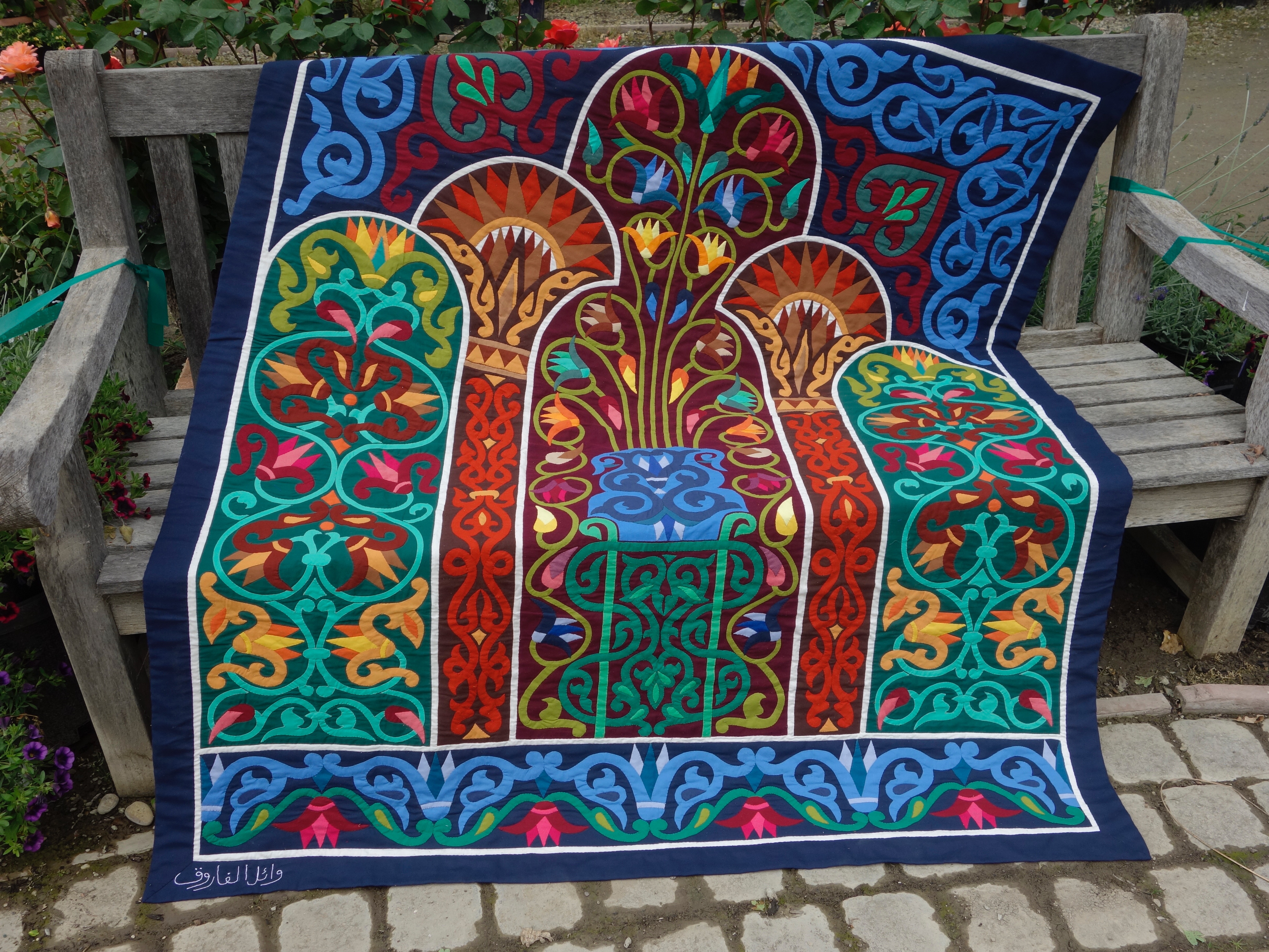 The columns with lotus tops are based on the columns of Karnak Temple in Upper Egypt. The stitcher is Wael from the shop of El Farouk who owns the rights to the pattern. Both of their signatures will be on the quilt measuring 140cm x 160cm (55"x63") and valued at US$ 1500.