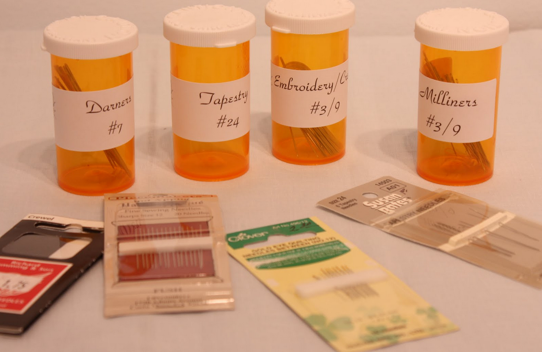 Straight pins, silk pins, long pins, short pins, safety pins...the list goes on and on. And then there is the whole assortment of sewing needles. How's a quilter going to keep all of these from becoming one big jumbled mess? This week's homework is to collect all of your pins and hand sewing needles (Click here to see how to organize machine needles). While you are digging them out, it might be a good time to take inventory of what pins/needles need replacing or you are running low on. There is nothing worse than being in the middle of a project and realizing that you don't have the proper needle.