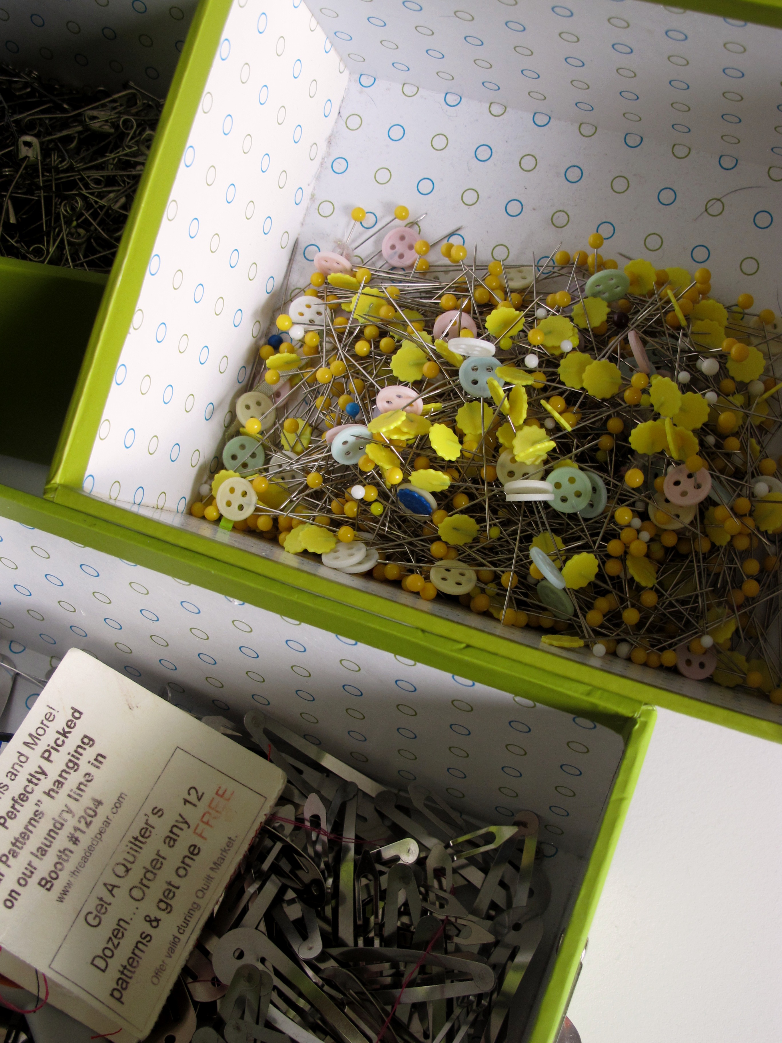 I guess I am an underachiever as I keep all my needles in a tin that a small cake came in; my colorful 1" safety pins in re-used sandwich meat plastic box.