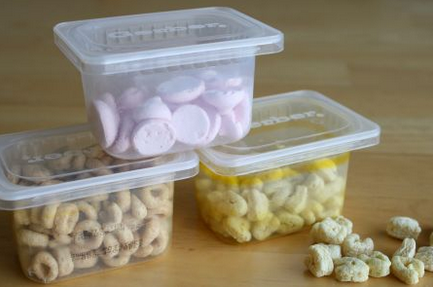 4. Rectangular baby food containers. These hold snacks, but they would also work for your needles and pins. MakeandTakes