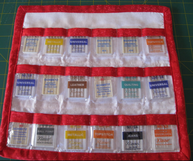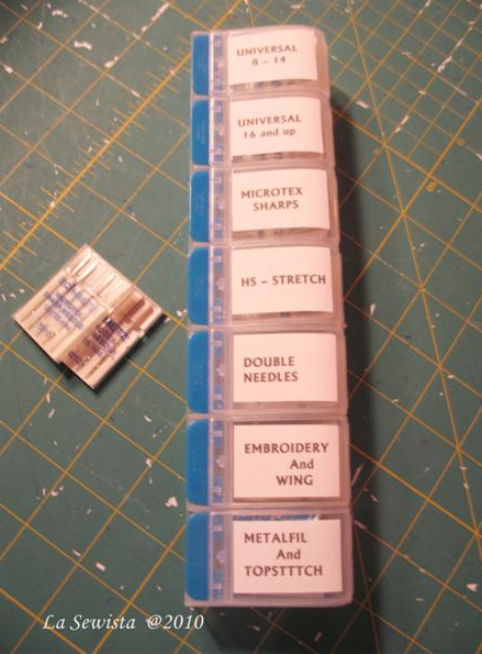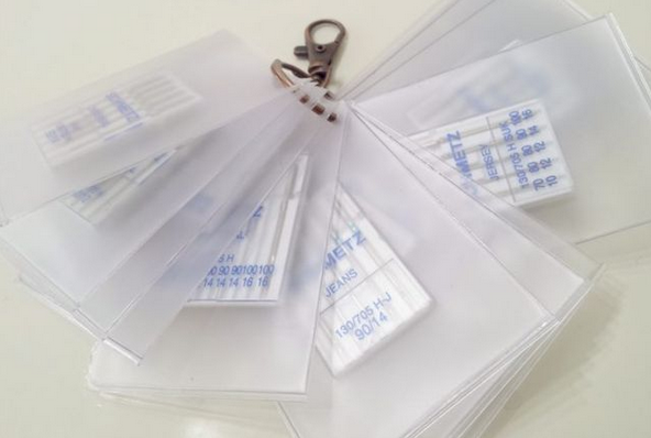 1. Use clear business card pages from an office supply store to hold needle cases. It’s easy to find the needle you’re looking for with these clear pages. You can also see at a glance which sizes you have and which ones you need to buy. Sewwhatsnew
