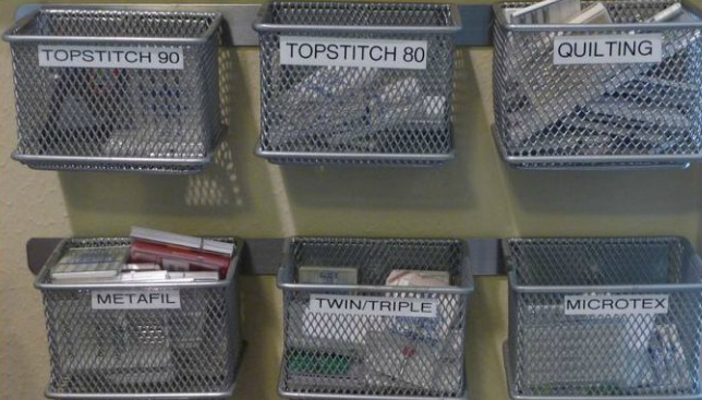 Now let's get to the creative ways to store and organize your machine needle collection. Here's an idea we found in Libby's studio. Magnetic (Container Store) strips mounted to the wall hold small labeled wire baskets (Container Store).