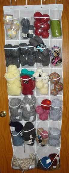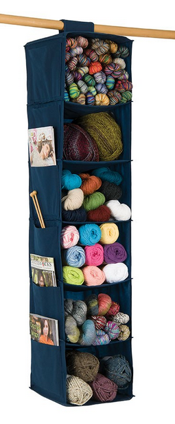 3. Hanging six-shelf yarn organizer with pockets for patterns. Patternworks