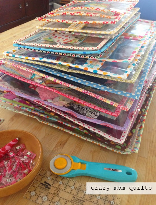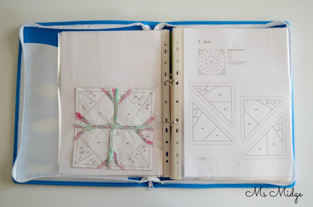 MsMidge stores blocks and templates for her year-long WIP until needed in a zip-up binder filled with clear sheet protector pages. The zip-style binder keeps all of the elements from falling out in the event that the binder is dropped.