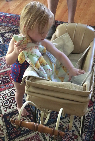 What a fortunate little girl to get the teddy bear and quilt. She looks so totally engrossed in playing!