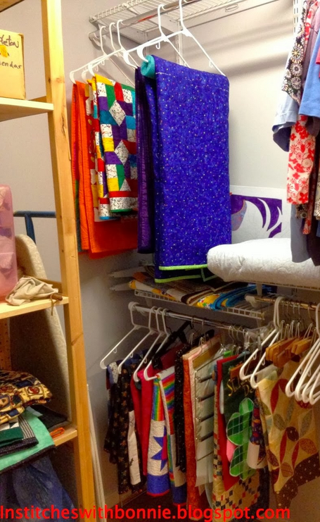 3. Plastic hangers hold tops waiting to be quilted. Institcheswithbonnie