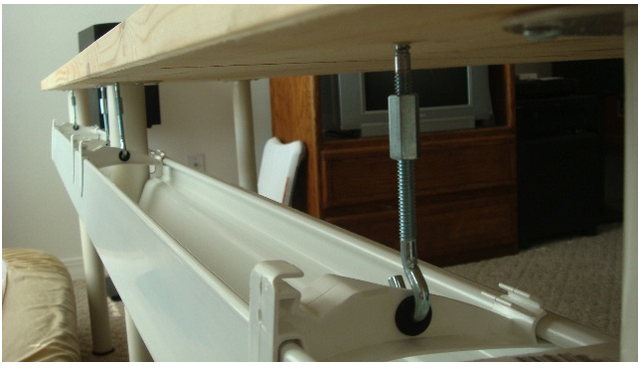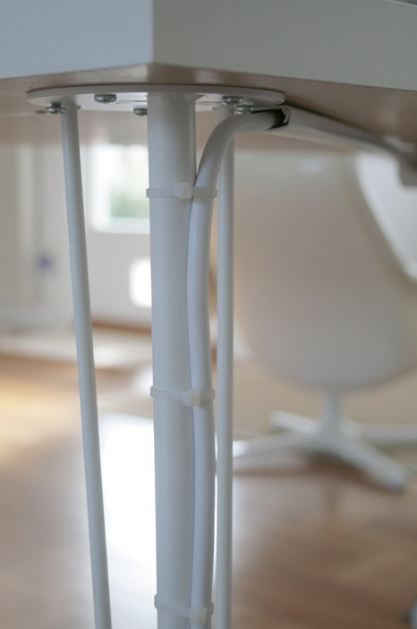 1. Hide the cord along the table legs using matching colored zip ties. (Chez Larson)