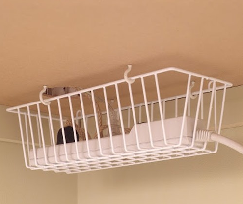 2. Hang a kitchen basket under your table for your surge protector. Organizeandinspire