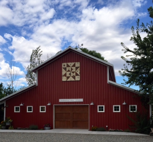 Last week the girlfriends and I headed over the mountains and through the fields...past several wineries and arrived at the most perfect stitching spot in the world...Crabapple Hill Studios the creation of Meg Hawkey in Benton City, Washington. Set in an agricultural area of Eastern Washington Crabapple Hill Studios is filled with all things quilts and embroidery designed entirely by Meg. It is a design studio and not a quilt shop, so is not open to the public. The way you get to enter this special place is by signing up for the 8 different workshop/retreats. Two sessions are offered back to back in each of the 4 seasons.
