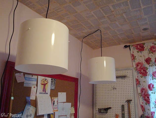 - Modern task lighting. Did you notice that the ceiling has been covered with pages from paperback books? From NobleVintage.