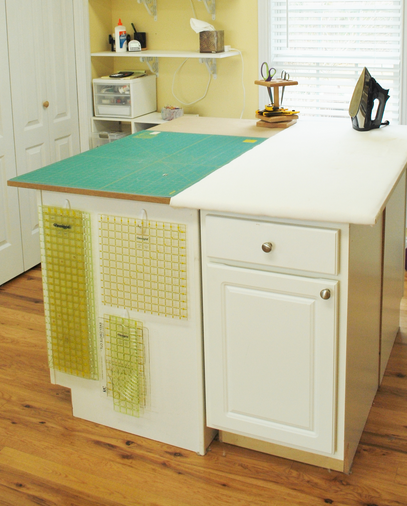 1. Most of my rulers, rotary cutters, drafting and stencil storage hang on a vertical pegboard (painted the color of the walls to blend in), but I do love this idea of hanging rulers with repositionable hangers on the side of the cutting/ironing station. Kathydrew