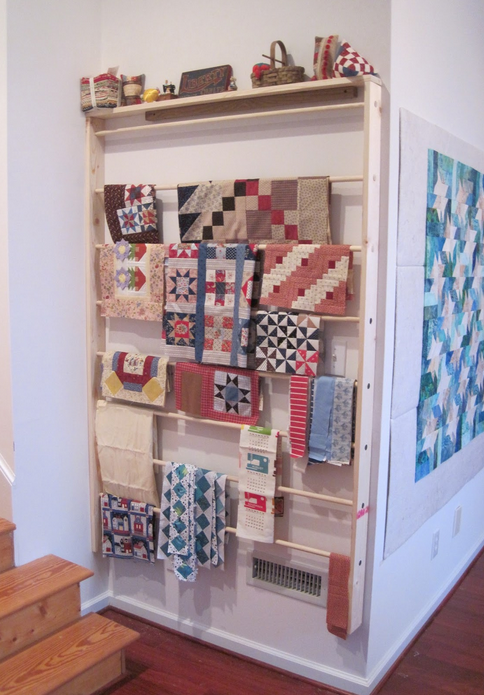 6. A rack with dowels offers storage and display. This doesn't take up much room and MK can hang her backing and binding while the quilt top is being completed.ThePatrioticQuilter
