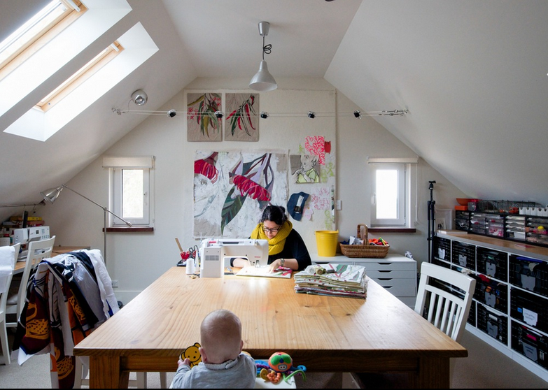 Ruth de Vos' upstairs studio includes good use of space and natural light for her textile work. ApartmentTherapy