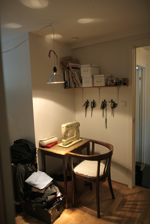 A bedroom wall serves as a divider for a well organized and functioning sewing room. Mayamade