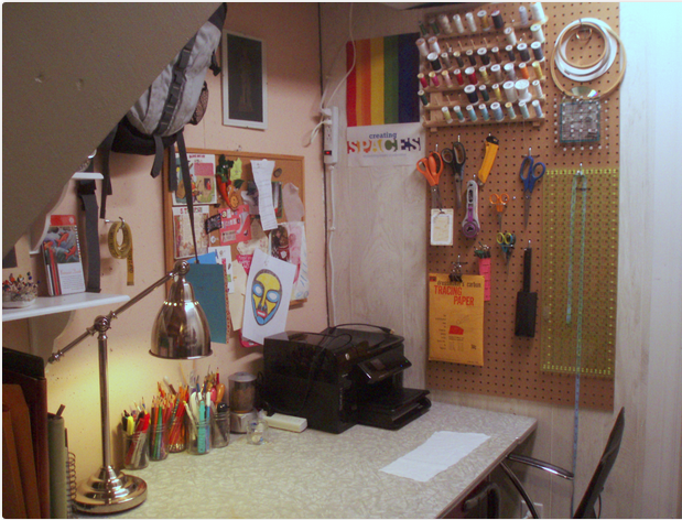 A well functioning sewing room under a staircase with only a 7' x 7' footprint. Velvetaubergine