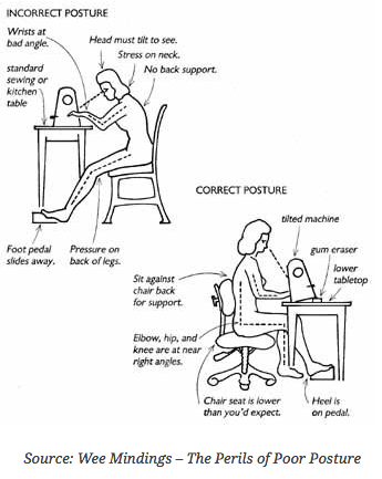 "One of the key concepts of ergonomics is keeping your body in a neutral position as much as possible. Neutral position is the most relaxed state for your body. Your weight is centered and your limbs are relaxed. Whether sitting or standing, your body should be centered on your work...Since very few sewing tables are adjustable for height, you can choose a chair with adjustable seat height. Your seat needs to be adjusted so that when your arms and shoulders are relaxed, your palms can rest on the sewing machine bed with your elbows forming a 90° angle." (Excerpt from Creating Your Perfect Quilting Space by Lois Hallock)